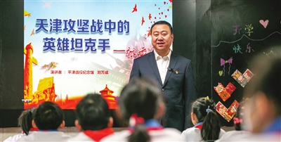 26日,全市中小学迎来新学期第一天,各学校通过丰富多彩的活动迎接归校学子。和平区新星小学邀请平津战役纪念馆讲解员刘万成,为师生们讲述了天津攻坚战中英雄坦克手张云亭的故事,在开学第一天给同学们上了一堂特别的微思政课。 本报记者 刘欣 摄