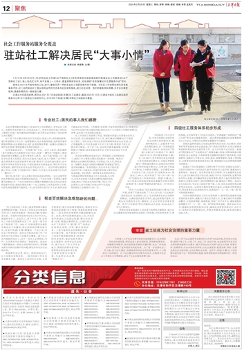 杨丽荣告诉记者,经过一段时间的运行,社工站服务效果显著。一是为民政工作补充专业服务力量。驻站社工运用专业方法,主动对接需求,提升民政服务精细化、精准化水平,促进民政领域“老小残弱”等惠民政策落实落地。二是为居民急难愁盼问题创新解决途径。比如,南开区鼓楼街道社工站、河东区春华街道社工站通过挖掘、整合社区资源,培育、赋能志愿者队伍,让他们成为社区工作者的“手、腿、眼、耳”,协助社区居委会发现、反馈、解决居民诉求。三是为基层社会治理制定系统化实施方案。每个街道(乡镇)社工站每年都会根据需求,结合机构自身优势,制定包括发展社区志愿服务、培育社区社会组织、提升社区工作人员专业能力、摸清民政服务基本底数和领办特色服务项目等方面的系统化实施方案,为基层社会治理“把脉开方”。