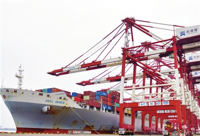 昨日,在天津港联盟国际集装箱码头“OOCL GENOA”(东方海外热那亚)轮作业中,首票雄安综合保税区进口海运货物通过“天津港雄安绿色通道”发往雄安综合保税区。 本报记者 吴迪 通讯员 李四航 摄