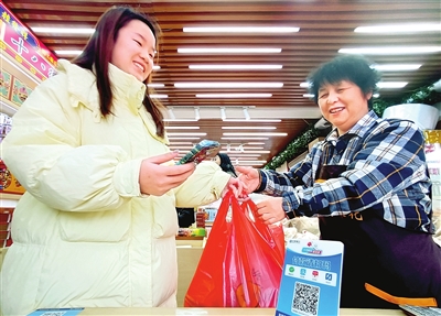 正说着,一位说话带着京腔的女士挑了几盒十八街麻花、二厂酱货过来扫码结账。只听扫码器“嘟”的一声之后,“天津银行收款……”的声音就响起。