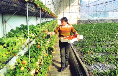 大棚内,一垄垄草莓秧长势喜人,白色的小花争相盛开,已经熟了的草莓色泽鲜红、娇艳欲滴。“现在每个大棚年收入近5万元,草莓成了石荒村村民的致富果。”王刚说,3年前,村民怕赔本,不愿入股,现在都争着到草莓园来打工。