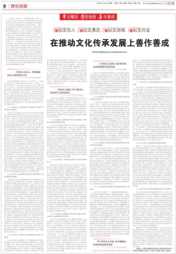 文化是一个国家、一个民族的灵魂。党的十八大以来,习近平总书记始终从现代化建设的大局思考文化的作用和力量,把文化建设摆在治国理政的突出位置,高度重视推动文化传承发展。习近平总书记视察天津重要讲话中提出“四个善作善成”的重要要求,其中之一就是在推动文化传承发展上善作善成,强调“以文化人、以文惠民、以文润城、以文兴业,展现城市文化特色和精神气质,是传承发展城市文化、培育滋养城市文明的目的所在”。这一重要要求,充分彰显了习近平文化思想“明体达用、体用贯通”的鲜明特征,充分体现了习近平文化思想作为“一个不断展开的、开放式的思想体系”的丰富发展,为我们更好担负“在新的起点上继续推动文化繁荣、建设文化强国、建设中华民族现代文明”这一新时代新的文化使命,指明了努力方向、明确了实践路径;这一重要要求,为宣传思想文化战线以文化之为服务大局、把习近平总书记殷殷嘱托全面落实到津沽大地上,提供了根本指针,赋予了强大动力。我们要认真学习领会习近平总书记重要讲话精神,深入学习贯彻习近平文化思想,牢记嘱托,学思践悟,努力在推动文化传承发展上善作善成,为以中国式现代化全面推进强国建设、民族复兴伟业贡献磅礴文化力量。