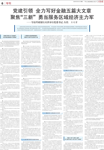 金融是国民经济的血脉,是国家核心竞争力的重要组成部分。中央金融工作会议强调,要加快建设金融强国,“做好科技金融、绿色金融、普惠金融、养老金融、数字金融五篇大文章”。作为国内系统重要性银行的一级分行,兴业银行天津分行如何发挥兴业特色优势,在津沽大地上尽情书写这五篇大文章?记者就此采访了兴业银行天津分行党委书记、行长王文雷。