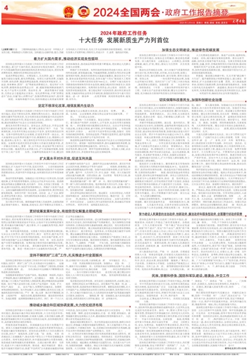 国务院总理李强5日在政府工作报告中介绍今年政府工作任务时提出,切实保障和改善民生,加强和创新社会治理。坚持以人民为中心的发展思想,履行好保基本、兜底线职责,采取更多惠民生、暖民心举措,扎实推进共同富裕,促进社会和谐稳定,不断增强人民群众的获得感、幸福感、安全感。
