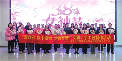今年是“三八”国际妇女节114周年,在“三八”妇女节即将来临之际,3月3日,中铁十二局集团电气化公司天津片区工会开展了主题为“爱自己,以手造物,以物寄情”女职工手工包制作活动,片区内24位女职工共聚一堂,共同庆贺这个属于妇女们的节日。活动中,女职工们齐动手,一个一个精美的手工包不断被制作出来。本次活动既愉快、健康,又陶治情操、愉悦身心,旨在展示女职工健康向上、乐观进取的风采,表达了她们对劳动与生活的热爱之情,营造隆重、热烈、喜庆的节日氛围。 通讯员 陈龙