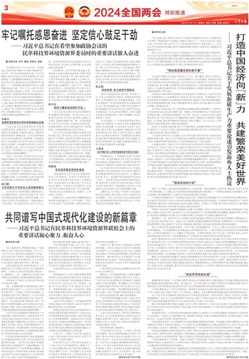 “民革要在对台工作大局中进一步找准定位、发挥优势、积极作为,更好团结海内外、岛内外一切可以团结的爱国力量。”“打好关键核心技术攻坚战,培育发展新质生产力的新动能。”“全面准确落实精准治污、科学治污、依法治污方针,推动经济社会发展绿色化、低碳化。”……殷殷嘱托指明前进方向,巨大鼓舞激发奋进力量。昨日下午,习近平总书记在看望参加全国政协十四届二次会议的民革、科技界、环境资源界委员时的重要讲话,让参会的6位住津全国政协委员倍感振奋。大家表示,习近平总书记的重要讲话温暖人心、催人奋进,我们将把对总书记的爱戴转化为牢记嘱托、感恩奋进的实际行动,坚定信心、鼓足干劲,发挥委员优势作用,深入调查研究,积极建言资政,广泛凝聚共识,为中国式现代化建设贡献智慧和力量。