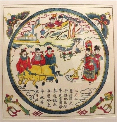 “二月二,龙抬头,大家小户使耕牛”。古人认为“二月二”迎来青龙,龙主管着下雨,此后雨水也就越来越多了,适合耕种的季节就此到来。古时有一幅龙牛开犁耕田的年画,名曰《皇帝耕田图》,画面上配有一首打油诗:“二月二,龙抬头,天子耕地臣赶牛,正宫娘娘来送饭,当朝宰相把种丢。春耕夏耘率天下,五谷丰登太平秋。”