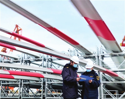图为天津临港海关关员在码头对风电叶片进行现场监管。