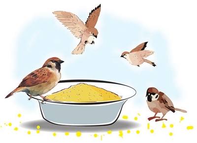年龄越来越大,就越想到自己儿时对鸟们那些难以启齿的经历,于是更觉得一定要善待它们。家里经常放着几袋米,大米、小米容易长虫,原来会把长了虫子的米,装进袋子扔到垃圾箱,虽然觉得可惜,但实在是没有更好的办法。后来在阳台上坐着,发现楼下的鸟飞来飞去,便想,不如把这些长了虫子的米给了它们。以后每天早晨,就抓一把虫米洒在草坪的甬道上。这时候麻雀就先来了,麻雀的警惕性是很高的,起初它们看着地上突然出现的食物,并不急于抢食,而是先在空中和树上飞过来、飞过去,认定不会有什么危险的时候,才会有一只麻雀落下来。这只麻雀站在小米旁边,左顾右盼,不急不缓,也许是在给同伴传递什么信号。等一会儿,在树上、灌木丛中的一群同伴纷纷落下来,围成一个圆圈,贪恋地啄食地上的米。我从楼下望去,中间是金色的小米,周围是那些啄食的鸟们,像一朵葵花。有的时候也来一些大鸟,像鸽子、灰喜鹊什么的。一开始它们来的时候,麻雀便被赶走了,后来时间久了,麻雀似乎也再没有了顾忌,大鸟飞来的时候,它们就一起啄食。
