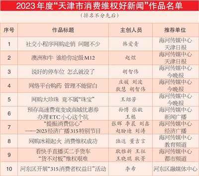 本报讯(记者 张雯婧)2023年度“天津市消费维权好新闻”评选昨日揭晓,10件新闻作品榜上有名。