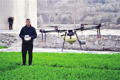 2024年3月9日,甘肃省陇南市武都区汉王镇农业技术推广站技术人员杨亮亮操作植保无人机给冬小麦施肥。 本组照片/新华社发