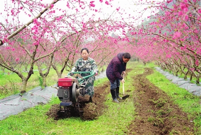 3月14日,在广西桂林市灵川县海洋乡水头村,村民在桃园里开沟施肥。
