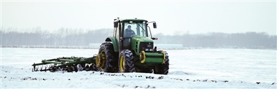 3月14日,在黑龙江北大荒农业股份有限公司友谊分公司第四管理区的地块内,一辆大马力拖拉机对耕地进行耙雪除冰作业,促进冰雪融化。