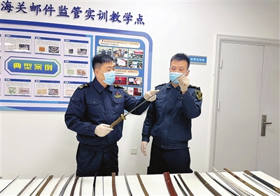 据悉,该进境邮件申报为“体育器材”,机检图像存在异常,现场关员人工查验后发现,包裹内物品为一批带鞘刀具,刀身长度均超过60厘米,最长的一把长达80厘米,且全部开刃。后经相关部门鉴定,上述物品为管制刀具。