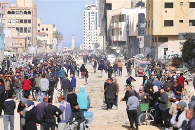 图为3月17日在加沙城拍摄的等待领取援助物资的人群。 新华社发