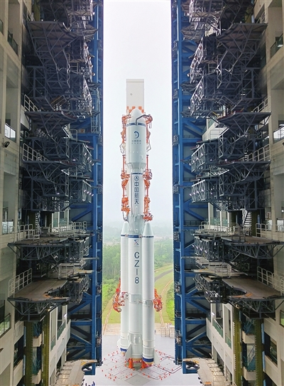 国家航天局消息,3月17日,探月工程四期鹊桥二号中继星和长征八号遥三运载火箭在中国文昌航天发射场完成技术区相关工作,星箭组合体垂直转运至发射区,计划于近日择机实施发射。 新华社发