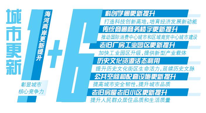 《指引》结合天津发展实际,将城市更新分为“1+6”个类型。其中,“1”是海河两岸更新提升,意在彰显天津地方特色;“6”是科创学圈更新提升、传统商圈商务楼宇更新提升、老旧厂房工业园区更新提升、历史文化资源活态利用、公共空间和配套设施更新提升、老旧房屋老旧小区更新提升,意在引领城市高质量发展。