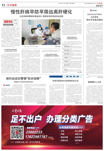 3月18日是第24个“全国爱肝日”。今年的主题是“早防早筛,远离肝硬化”,倡议全社会关注自己和身边人的肝脏健康,主动筛查、规范治疗、定期随访,积极防治肝硬化。市第二人民医院肝病专家表示,没有及时治疗,几乎所有慢性肝病都可发展为肝硬化。在我国,慢性病毒性肝炎、酒精性肝病、代谢相关脂肪性肝病是肝硬化的重要原因。早筛早诊早治慢性肝病可阻断肝炎、肝硬化、肝癌进程,是预防肝硬化、远离肝癌的重要举措。