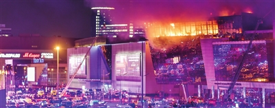 3月22日,俄罗斯莫斯科近郊克拉斯诺戈尔斯克市一音乐厅发生枪击事件后引发火灾。 新华社发