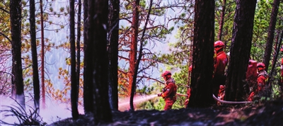 图为3月21日,四川省森林消防总队特勤大队消防员在火场清理烟点。 新华社发
