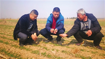 中旺镇农技专家在麦地里查看苗情、墒情,把“麦”开方。 照片由受访单位提供