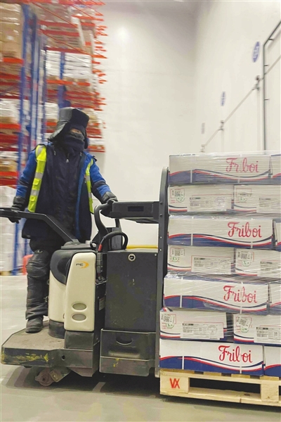 日前,记者在万纬天津东疆港冷链园看到,一辆辆冷链卡车鱼贯而入,司机们按照提货单信息将车停放在不同的出货口。“最近每天有五六十辆提货车,春节期间高峰时有200辆车排队入园。”该冷链园销售经理朱秋岳告诉记者,园区主要为客户存储进口肉类、水产、乳制品、水果等货物,其中京津冀客户占比约30%。