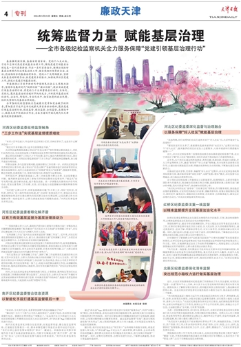 全市各级纪检监察机关忠诚履行党章和宪法赋予的职责,贯彻落实习近平总书记视察天津重要讲话精神,聚焦党建引领基层治理行动,跟进监督、精准监督、全程监督,在围绕中心、服务大局中彰显担当作为,为奋力谱写中国式现代化天津篇章提供坚强保障。
