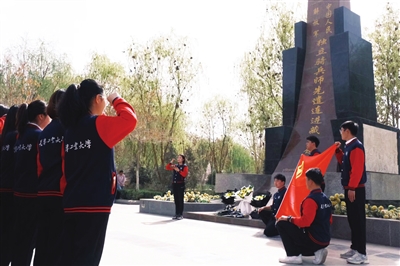 天津工业大学援疆支教团在新疆和田地区于田县“独立骑兵师先遣连进藏纪念碑”前缅怀先烈。
