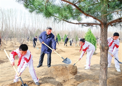 挥锹铲土、培土围堰、提水浇灌……习近平接连种下油松、黄栌、元宝枫、樱桃、红叶碧桃、侧柏等多棵树苗。习近平一边植树,一边询问孩子们的学习生活、劳动锻炼情况。他强调,广大青少年是祖国的未来,从小要积极参加劳动、植树造林,把绿色的种子种进心里,养成尊重自然、热爱自然的意识,勤奋学习、锻炼身体、茁壮成长,德智体美劳全面发展,努力成为国家栋梁。植树现场一派热火朝天的劳动景象,领导同志们同大家一起培土浇水,气氛热烈。