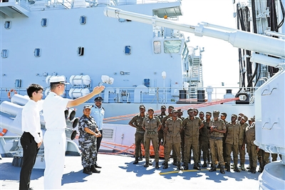 图为4月2日,莫桑比克官兵参观中国海军第45批护航编队临沂舰。 新华社发
