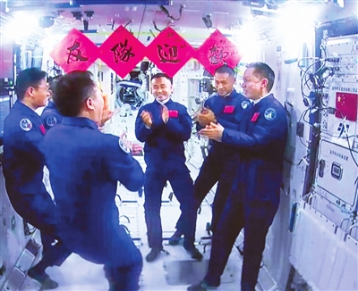 在北京航天飞行控制中心拍摄的神舟十六号航天员乘组与神舟十七号航天员乘组交流的画面。 新华社发
