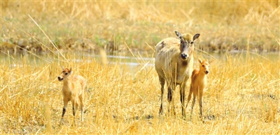 昨天,我市七里海湿地工作人员巡护时发现,两头小麋鹿在母亲的带领下走出苇丛,加入到附近的麋鹿群。据悉,它们是今年我市野生环境下首批被发现的新生小麋鹿,较去年提前了近十天。 通讯员 韩克武 本报记者 钱进 摄