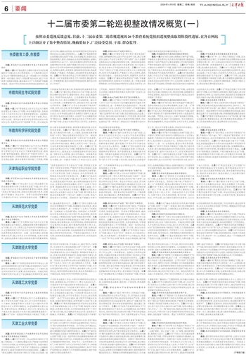 小巡:由于被巡视单位整改情况涉及内容较多、篇幅较长,这次在《天津日报》、《今晚报》、津云等市级媒体刊发的是各单位巡视整改情况“简略版”。对于巡视整改详细完整情况,各被巡视单位此前已按相关要求在本单位的官方网站上予以全文公开,大家可前往被巡视单位官方网站搜索阅览(网址附后)。