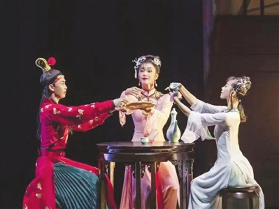 那天晚上,我坐在国家大剧院歌剧院里,观赏江苏大剧院舞剧团演出的原创民族舞剧《红楼梦》。在正式演出之前,演员们有一段30分钟左右的暖场。主舞台从左至右横贯着一张长条木桌,上面放着一只瓷瓶,舞台深处有一把高背椅。剧中饰演金陵十二钗的舞者依次出场,走至桌前。她们手中各持一株花枝,或侧身自嗟,或低头沉思,随后安静而专注地将花枝插入瓶中。纱罗斗篷在射灯的光束下折射出丝丝缕缕的光彩,映衬出女儿们的姣好容颜。当最后出场的黛玉将手中的芙蓉花放下时,钟声响起,长桌缓缓下沉,台上的人物翩然退场,台下的观众屏息以待——该入梦了。