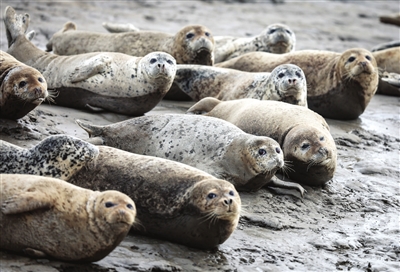4月9日,西太平洋斑海豹在辽宁盘锦三道沟海域的滩涂上休息。