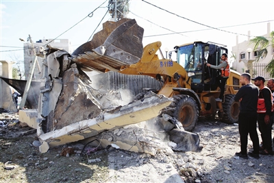 图为4月9日,在加沙地带中部迈加齐难民营,工程车辆在以军空袭后清理废墟。 新华社发