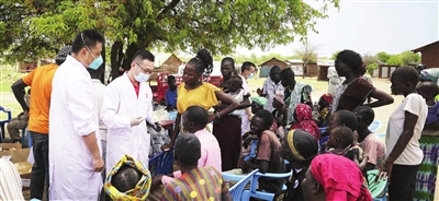 图为4月10日,在南苏丹首都朱巴西南的纳吉图恩村,中国医疗队医生为村民义诊。 新华社发