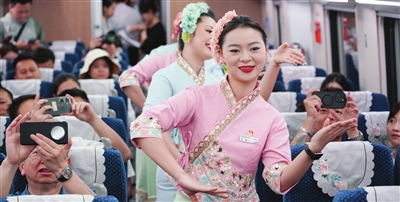 图为4月13日,工作人员在中国西双版纳至老挝琅勃拉邦首发列车上表演。 新华社发