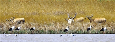 图为麋鹿群正在白色头鹿的带领下,与一旁的几只东方白鹳一起觅食、嬉戏,和平共处。