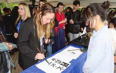 图为在阿尔巴尼亚地拉那大学孔子学院举办的中文日庆祝活动上,人们体验中国书法。