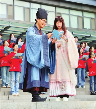4月23日,天津师范大学图书馆举办集体朗诵快闪活动,近千名学生参加。