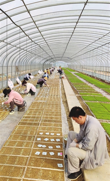 忙着水稻育苗的还有位于天津市西青区王稳庄镇的天津天隆科技股份有限公司。走进该公司的国家粳稻中心育繁种基地,工作人员将一个个育秧盘摆上传送带,不时地补充种子和水稻基质到进料口,接下来的工作便交由联合水稻播种机。“这些种子已经提前完成浸种、包衣,把它们撒在盛有2厘米厚基质土的秧盘里,再覆上薄薄的基质土和薄膜遮光保温,保持一定的水分供给,大概1周后,水稻秧苗就能破土而出了。”公司科研部工作人员余子嘉告诉记者,近一个月,基地30多座大棚摆满了育秧盘,其中,软米“小站香1号”和紫糯米“津特6”都是适合京津冀地区种植的特色优质品种。