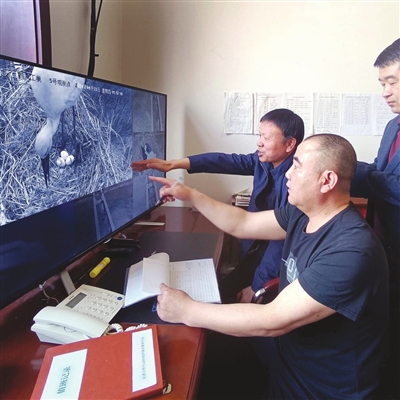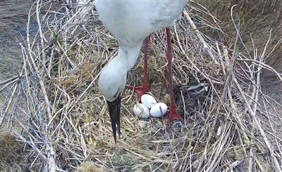 目前,5个巢穴都发现了东方白鹳的身影,其中,第5号巢穴已发现了3枚鹳卵。