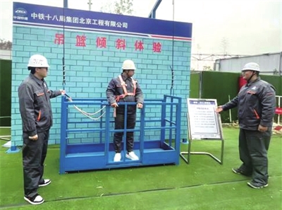 图为职工在安全体验馆进行吊篮倾斜体验。