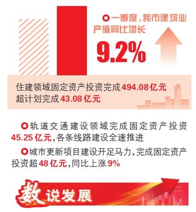 重大项目建设是推动经济增长的重要动力,也是实现城市高质量发展的关键支撑。今年以来,市住房城乡建设委靠前发力,推动住建领域开复工、促投资、促销售,强化分析研判和运行调度,深入重点区、重点企业细化服务,超额完成预期经济指标。一季度,我市建筑业产值同比增长9.2%,住建领域固定资产投资完成494.08亿元,超计划完成43.08亿元,其中轨道交通建设、城市更新项目投资成绩亮眼。