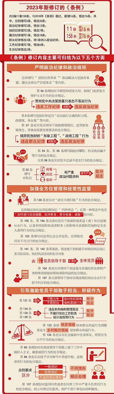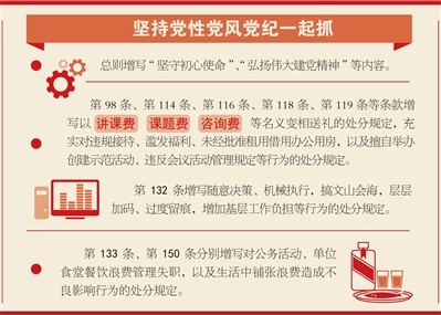 严明生活纪律,锤炼道德品行。新修订的《条例》,聚焦促进广大党员带头践行和弘扬社会主义核心价值观充实完善生活纪律,以更好发挥党员干部言行对全社会的示范效应。着眼落实习近平总书记反复强调的“坚持勤俭节约、反对铺张浪费”重要要求,明确生活中铺张浪费造成不良影响行为的处分规定,促进广大党员锤炼道德品行,以优良党风引领社风民风。着眼规范约束党员网络言行,明确对违背公序良俗、在网络空间有不当言行的处分规定,促进党员做到网上、线下一个样,绷紧网络不是法外之地这根弦。