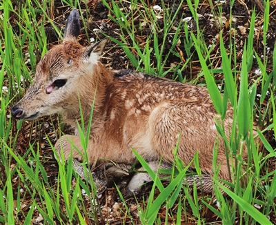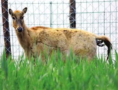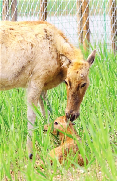 4月22日下午4时许,江苏大丰落户津城的麋鹿终于当上了妈妈,在七里海湿地顺产诞下一崽。工作人员路过鹿岛时,恰好看到小鹿正从母体中露出小脚丫,而母鹿因为阵痛,一直绕岛走来走去。忽然,它直接卧到芦苇丛中,几分钟后再起身时,身边已多了头湿漉漉的小鹿。母鹿不停地为小鹿舔舐着身体,小鹿则趴在苇丛中享受着母亲的爱抚。23日上午,工作人员发现,小鹿已可以站立并随母亲一起嬉戏、跑动。 通讯员 韩克武