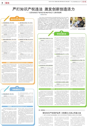 此次天津市知识产权局发布的2023年度天津市知识产权行政保护典型案例,涉及到生产生活的方方面面,发挥了良好的震慑和警醒作用。打击这些违法行为不仅是尊重知识、保护创新的体现,也切实维护了消费者权益,让大家买得放心、吃得安心、用得舒心。