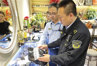 ◆案例简介:2023年4月21日,和平区市场监督管理局执法人员根据线索,对天津市和平区五大道街道重庆道225号1F108康德宝汇寄卖店进行检查。现场查获标称“LV”卡包7个、挎包25个、项链16条、手链6条、手镯7个、手绳13个、戒指1个、手机壳2个,共计77件商品。经商标权利人鉴定证明,依据国家知识产权局《商标侵权判断标准》判定,属侵犯注册商标专用权商品,违法经营额约3.2万元。