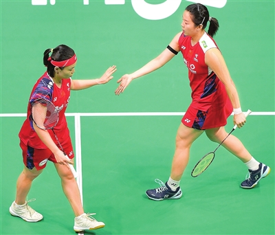 本轮国羽女单继续派出何冰娇、韩悦和王祉怡,女双则进行调整,第一女双贾一凡/陈清晨迎来亮相,第二女双“拆对”,由刘圣书搭档张殊贤出战。此前对阵李文珊,何冰娇8战全胜。此番再度相遇,李文珊给何冰娇制造了很大麻烦。21:19、21:19,何冰娇用时46分钟才险胜,这也是开赛以来国羽耗时最长的一场胜利。何冰娇表示,经过首轮的适应,自己相对更放松。连续两场担任一单,已逐渐适应了打头阵的感觉。